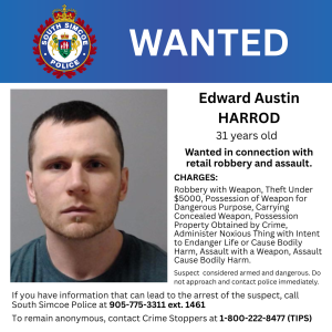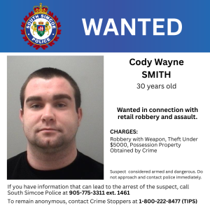 The South Simcoe Police Investigative Services team have conducted the investigation, and two suspects have been identified. Both suspects are currently wanted on the related charges in connection to the retail robbery and assault incident. Investigators are releasing their images and are appealing to the public for information on their whereabouts. The suspects are considered armed and dangerous. Members of the public are advised not to approach them and to contact police immediately.